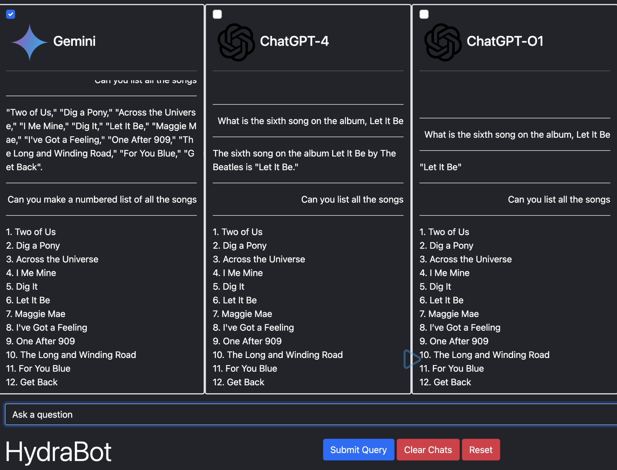 The idea behind Hydrabot is that when a user interacts with an LLM there is no way to tell if the LLMs responses are factual or hallucinations. So, by having multiple LLMs respond to the same prompt, users would notice if any of them diverge in any meaningful way, signafying that something was wrong.