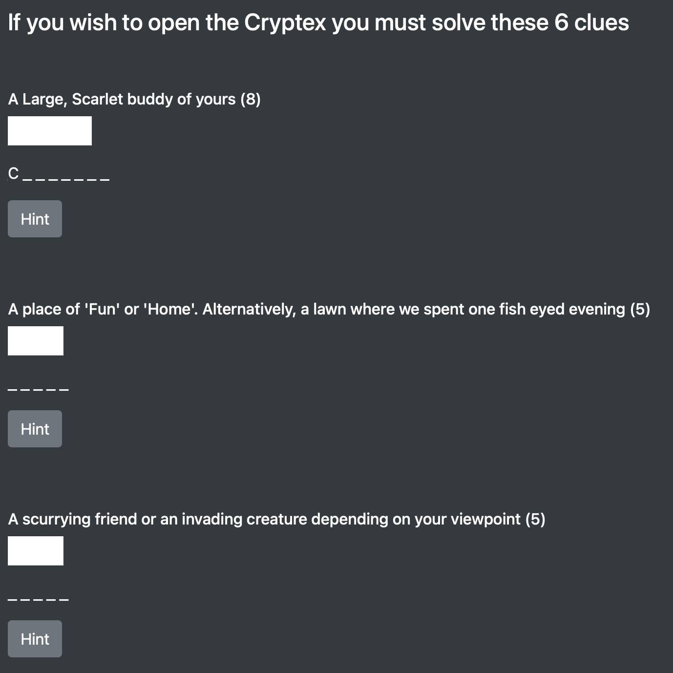 A simple website/puzzle I made for my Girlfriend. When all of the riddles were solved it revealed a key, which she could use to open a Cryptex and receive the gift inside.